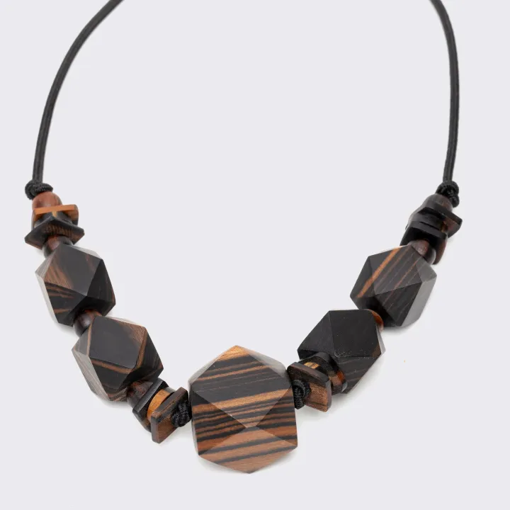 The "Tamon" necklace features an artistic arrangement of geometric beads. This contemporary design blends bold shapes with elegant details, creating a distinctive and stylish statement piece.